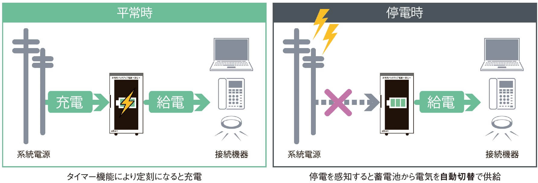 ガソリンエンジン発電機と違い、電気を貯めて使うため、排気ガスの排出がなく、騒音や熱も発生しません。屋内用でテナントビルや自家発電装置の設置が難しい場所に最適です。
