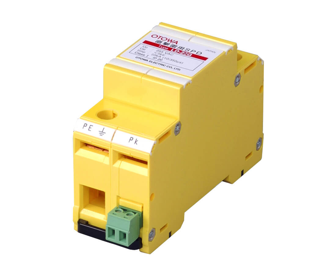 直撃雷対応。電源や接地(アース)から侵入する雷サージから機器を保護します。電源用SPD(避雷器、アレスタ)。JIS C 5381-11対応。直撃雷の分流成分を処理し、配電盤や分電盤に取り付けます。AC用、DC用(PV太陽光発電)や三相一体形などラインアップ。